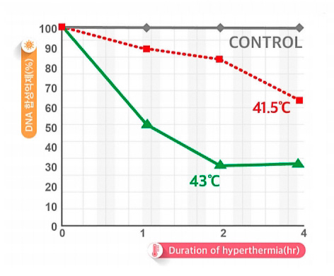 43°C이하의 온도에선 0.5°C의 차이가 세포생존에 지대한 영향을 미치고,